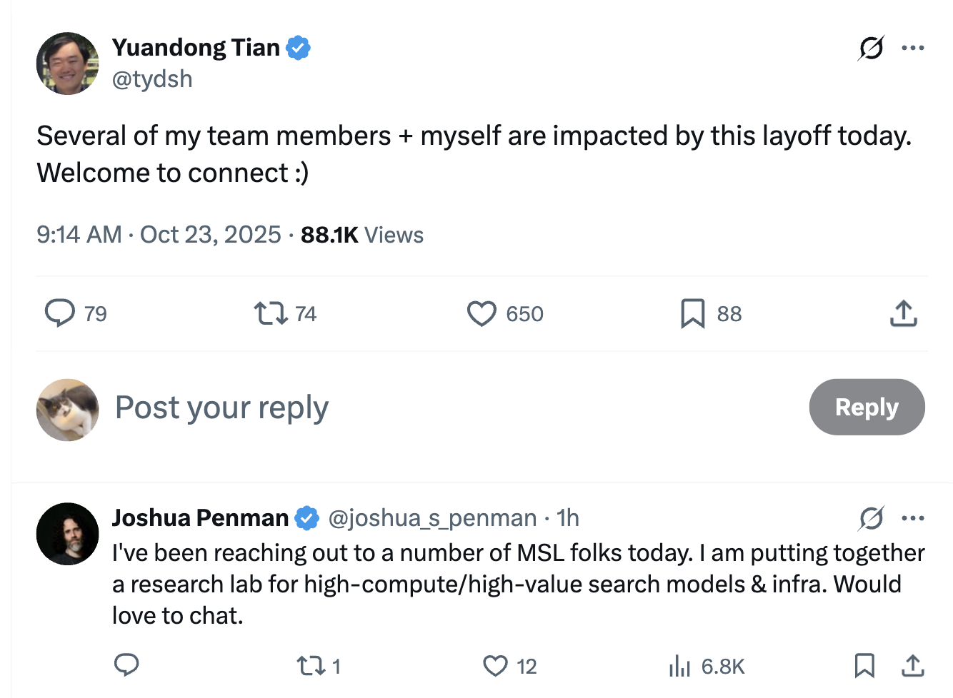 值得注意的是,裁員波及了華人AI大佬、FAIR研究科學家總監(jiān)田淵棟,他在社交平臺X上公開表示自己和團隊成員均受到影響。