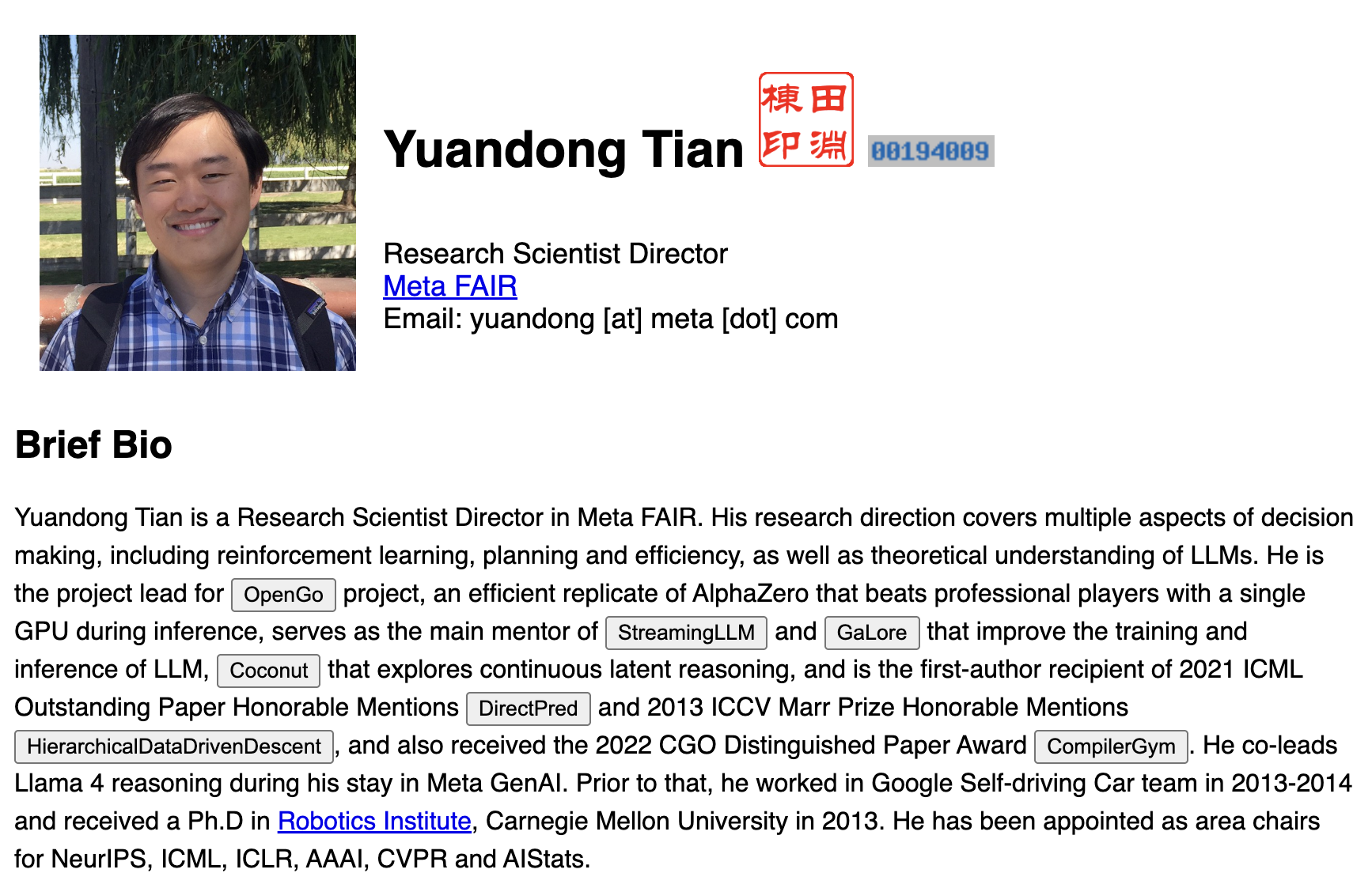 田淵棟是AI領域的重要華人研究者、科幻作家。他于2013年從美國卡內(nèi)基隆大學機器人研究所博士畢業(yè),2016年加入Meta GenAI擔任研究科學家,研究方向涵蓋強化學習、規(guī)劃與效率以及對大型語言模型的理論理解,曾參與領導了OpenGo項目研發(fā)、Llama 4推理等工作,獲得過2021年ICML杰出論文榮譽提名、2022年CGO杰出論文獎等重要獎項。此外,他還撰寫了硬核長篇科幻小說《破曉之鐘》。