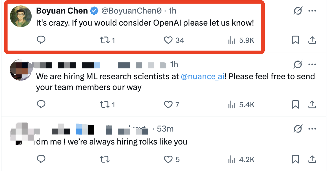 田淵棟貼文評論區(qū)迅速成為“招聘現(xiàn)場”,美國風投公司South Park Commons創(chuàng)始人Joshua Penman直接發(fā)出邀請,稱正在組建相關(guān)實驗室;OpenAI研究員Boyuan Chen也留言表示“這太瘋狂”,并鼓勵田淵棟考慮加入OpenAI。