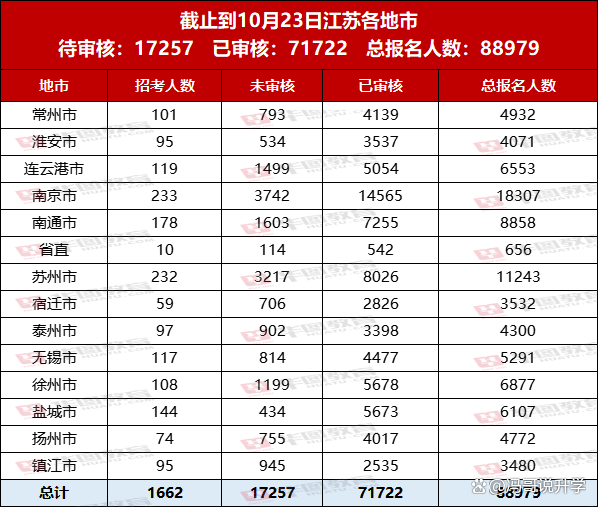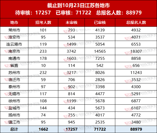 截至 10 月 23 日 16 時(shí),2026 年國(guó)考江蘇地區(qū)報(bào)名人數(shù)達(dá)到了 93901 人,其中 81446 人已經(jīng)通過(guò)審查。不過(guò),還有 4 個(gè)職位壓根沒(méi)人報(bào)名呢。要說(shuō)江蘇競(jìng)爭(zhēng)最激烈的職位,那非江蘇監(jiān)管局(一級(jí)主任科員及以下)莫屬,競(jìng)爭(zhēng)比高達(dá) 1520:1。(這里給大家解釋一下哈,競(jìng)爭(zhēng)比就是用報(bào)名人數(shù)除以招考人數(shù),而報(bào)名人數(shù)等于過(guò)審人數(shù)加上未審核人數(shù)。)